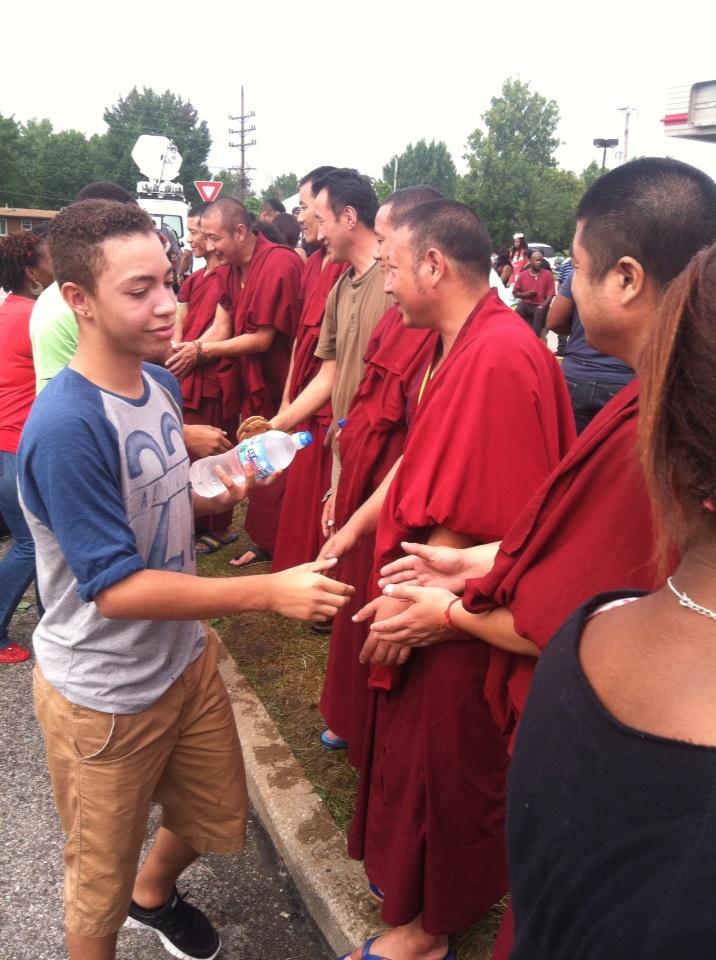 UPDATE The six Tibetan Buddhist monks are from the Drepung Monastery and in the U.S. as part of the Drepung Gomang Sacred Arts Tour 2014. They traveled from one of their first stops on the tour, St. Louis, to nearby Ferguson, to stand in solidarity with the townspeople there in the wake of the shooting death of Michael Brown by a police officer.